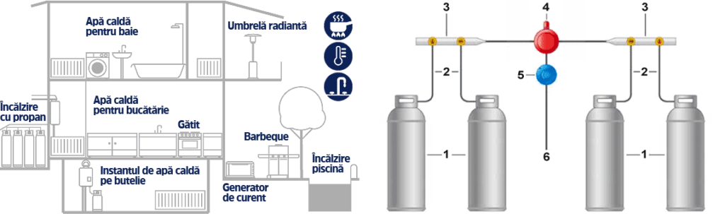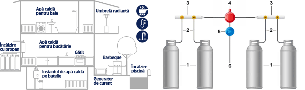 Buteliile cu GPL (propan) care alimenteaza centrala, sunt de obicei in numar de 2, 4, 6, sau 8, legate in doua grupuri , grupuri cu numar egal de butelii.