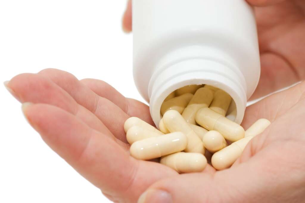 Hands full of pils isolated on white background